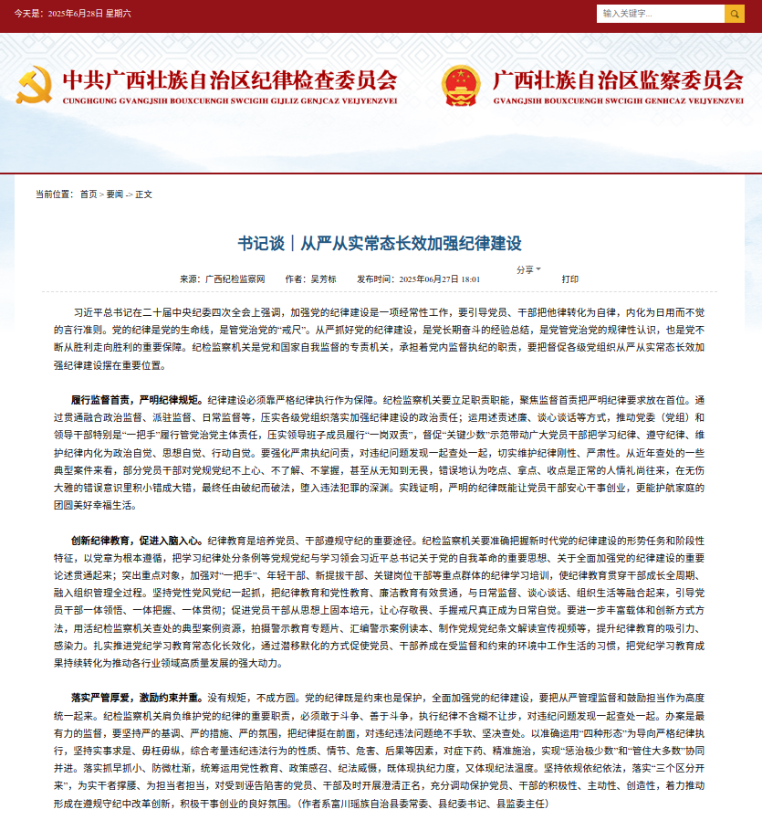 【广西纪检监察网关注富川】书记谈|从严从实常态长效加强纪律建设