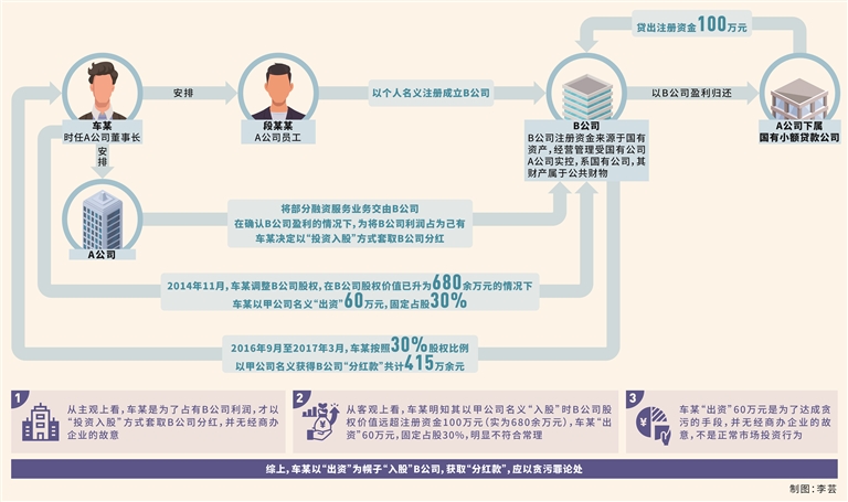 第二,车某的所谓出资行为并非市场投资行为,而是其利用职务便利获取本属于国有公司B公司的确定性预期收益的犯罪手段。本案中,车某明知其以甲公司名义“入股”时,B公司实际资产高于注册资金100万元。经查,在车某以甲公司名义“入股”B公司时,B公司实际股权价值为680余万元,车某“出资”60万元占股30%,明显不符合常理,换言之,车某“出资”60万元不应获得30%股权。车某的真实目的是在不承担市场风险的前提下,利用担任A公司董事长的职务便利,将A公司确定能够盈利的融资业务交给B公司经营,并在确认B公司能够盈利的情况下,以“出资”为幌子“入股”B公司,获取“分红款”,应以贪污罪论处。