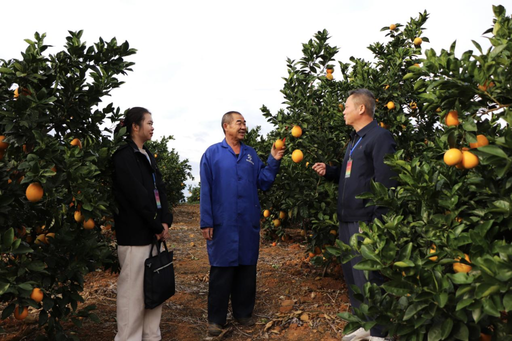 当前,富川瑶族自治县特色支柱产业脐橙成熟上市,果园里一派丰收忙碌的景象。该县纪委监委立足监督的再监督职责职能,督促相关职能部门加强作风建设、认真履职尽责,全力护航各项惠农政策落地见效。图为11月11日,该县纪检监察干部深入脐橙种植一线,向果农了解相关补贴资金落实情况。(首春英 摄)