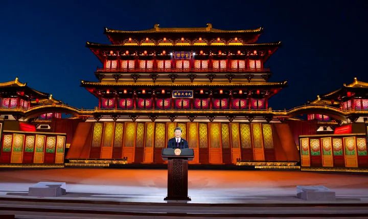 5月18日晚,国家主席习近平和夫人彭丽媛在陕西省西安市大唐芙蓉园为出席中国-中亚峰会的中亚国家元首夫妇举行欢迎仪式和欢迎宴会。宴会后,习近平夫妇同贵宾们共同观看中国同中亚国家人民文化艺术年暨中国-中亚青年艺术节开幕式演出。这是习近平发表欢迎致辞,代表中国政府和中国人民热烈欢迎中亚各国元首。新华社记者 黄敬文 摄